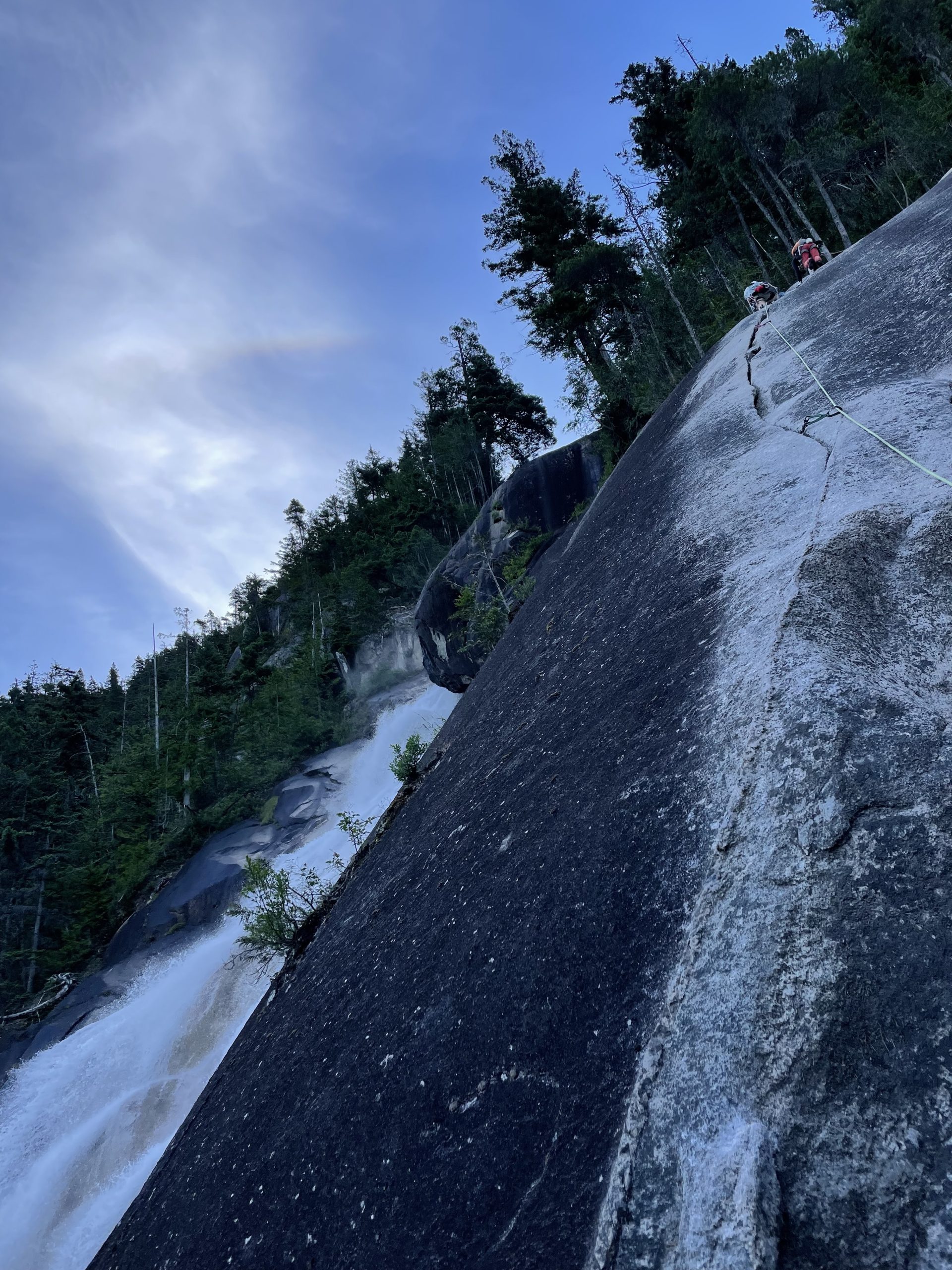 シャノンフォールというスコーミッシュの人気観光地である滝の真横を登れるんですね。しかも、ただ易しいだけでなく、1ピッチ目は Klahanie Crack 5.7 というトップ100のとっっっても綺麗なハンドクラックなんです!