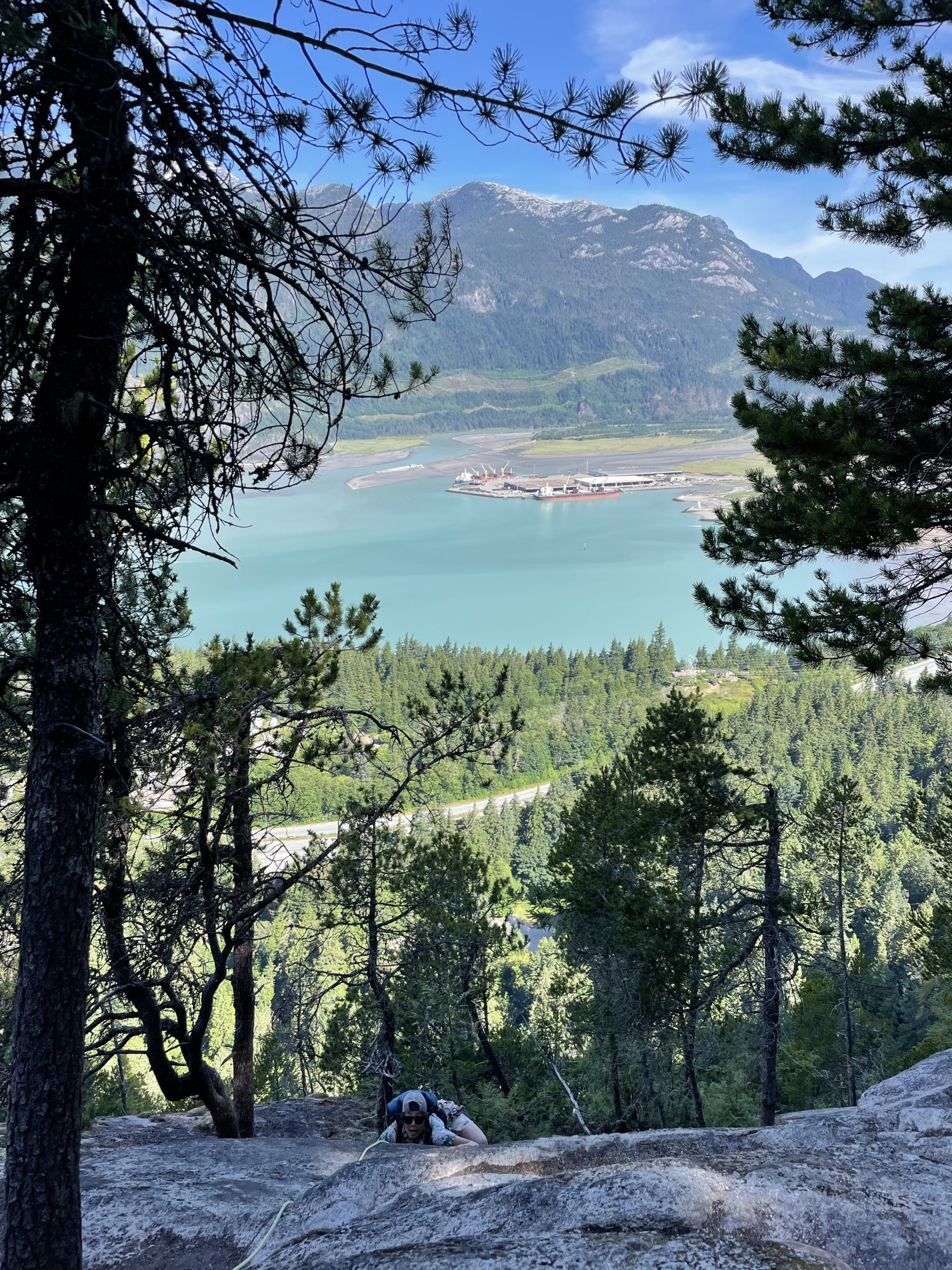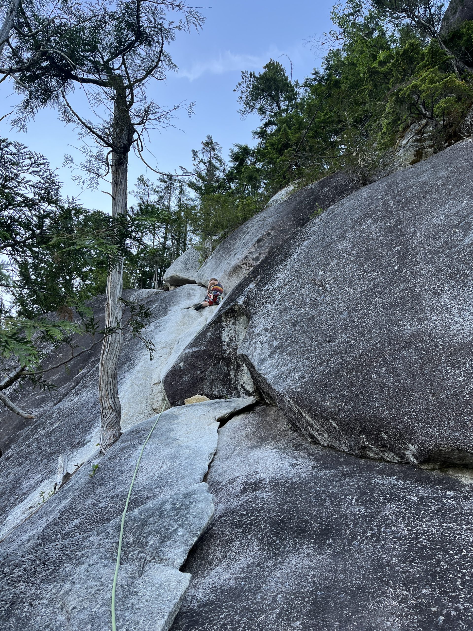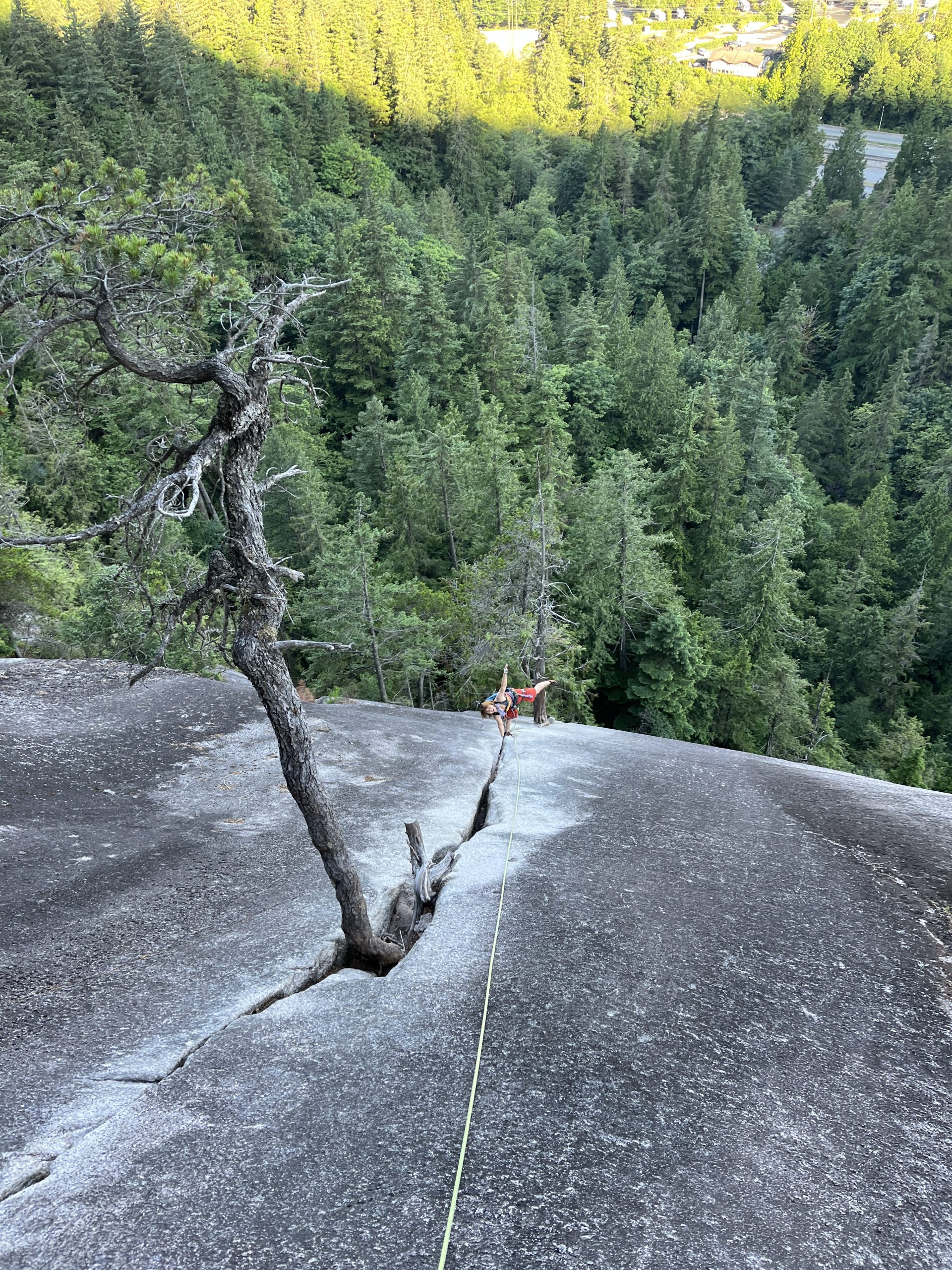 なので、先行パーティのレベル次第でピッチを一つずつ切るのか、リンクするのか変わります。スコーミッシュでは多くのクライマーがのんびり列を成して登っていても、ピリピリすることなくすごくチルに登っています。ルート名「The Spirit of Squamish(スコーミッシュの精神)」の通り、気長に気楽にいくのが吉でしょう。