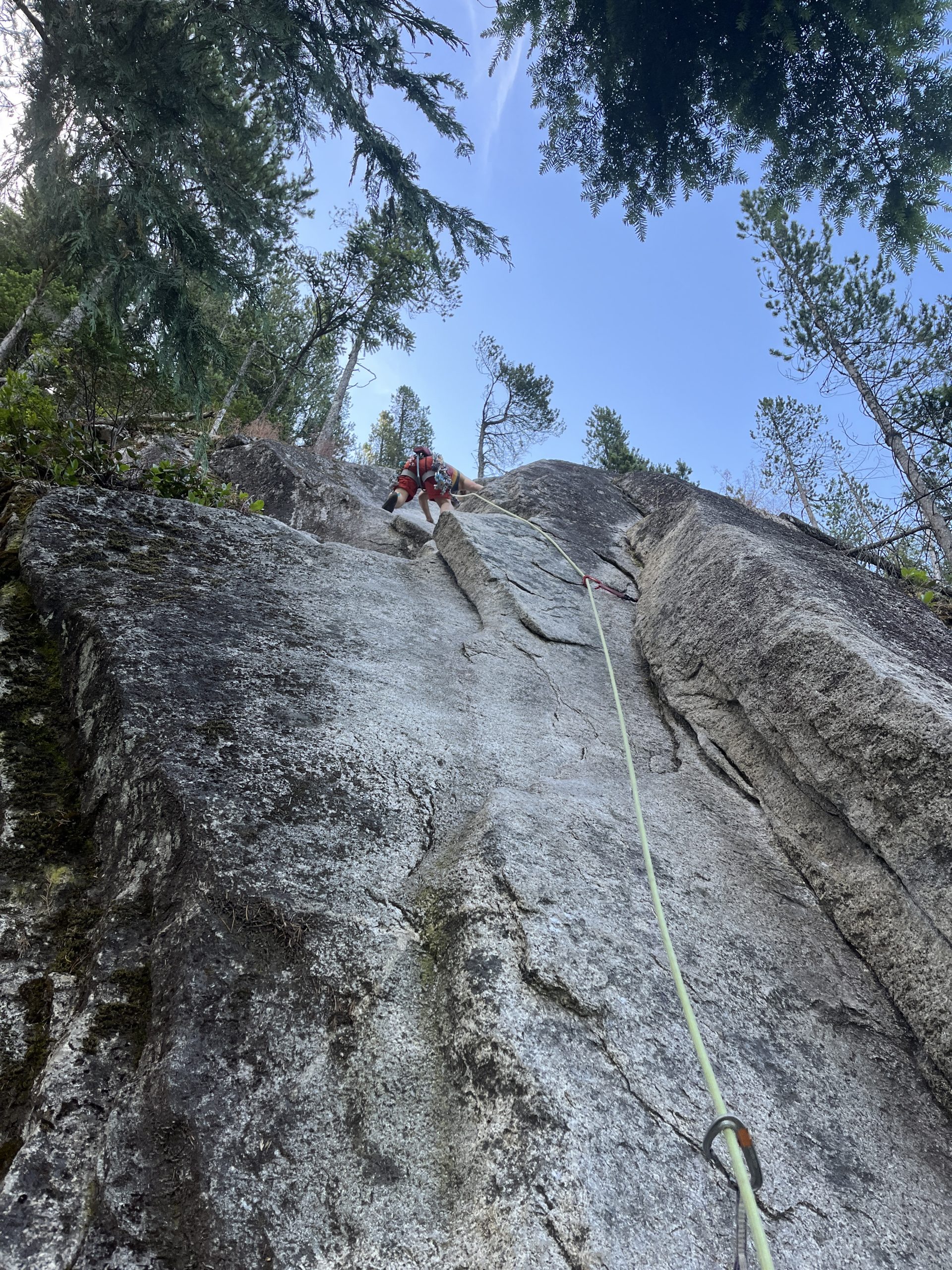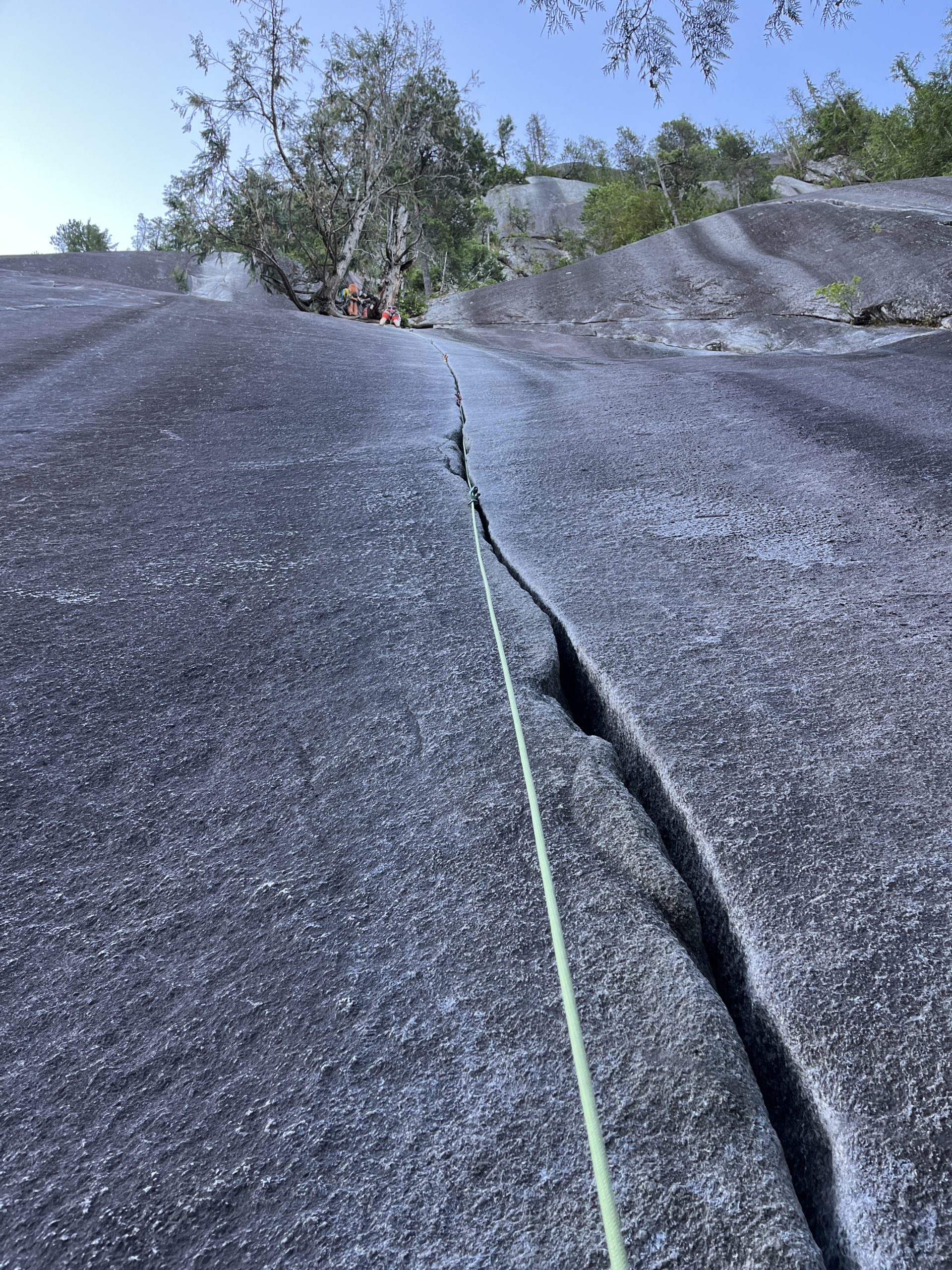 最初はガバフレークをガシガシ登ります。その後は次第に細くなるクラックを辿り、最後は再び広がったクラックをうまく登ります。このクラックが広くなってしまうセクションにはフェイス面にボルトがありました。