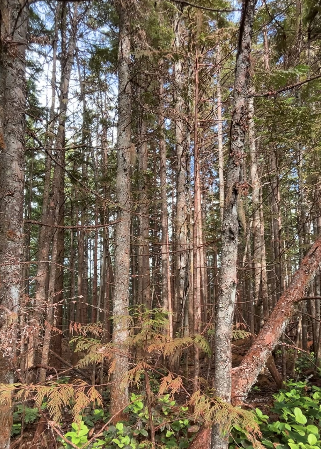 スコーミッシュは内陸に比べて海に面しているので山火事のリスクは少なめですが、それでも、今年初夏に山火事が発生しています。毎日消火活動がなされ、トレイルの封鎖や近隣への避難勧告もありました。最近、封鎖トレイルもようやく徐々に解放されてきまして、行ってみたところ、ある地点を境に森の色が緑から赤に変わっていました。