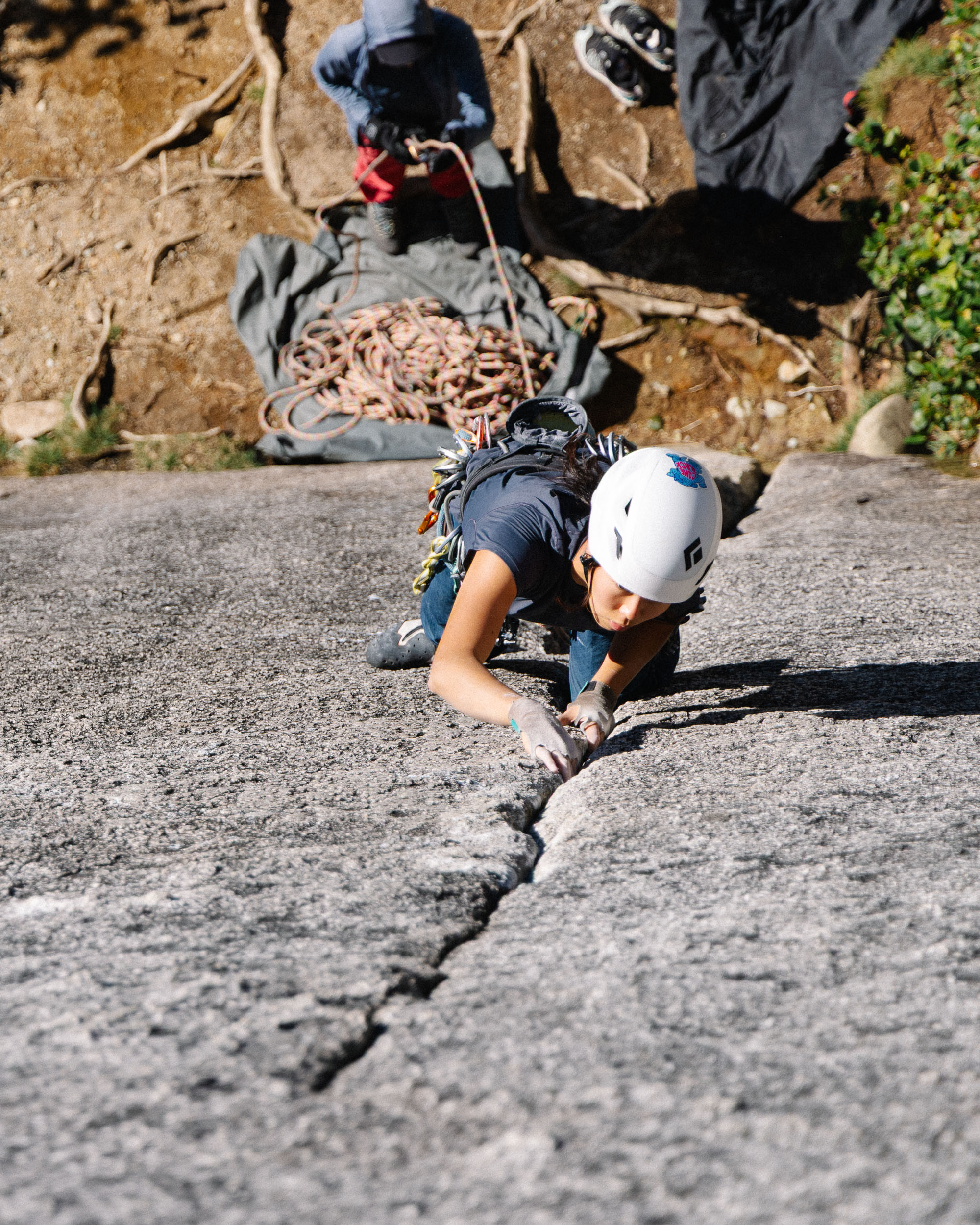 最初は綺麗なクラックを登っていきます。そして、カンテに向かって右へトラバースし、カンテを抜けてスラブを登るというラインになります。