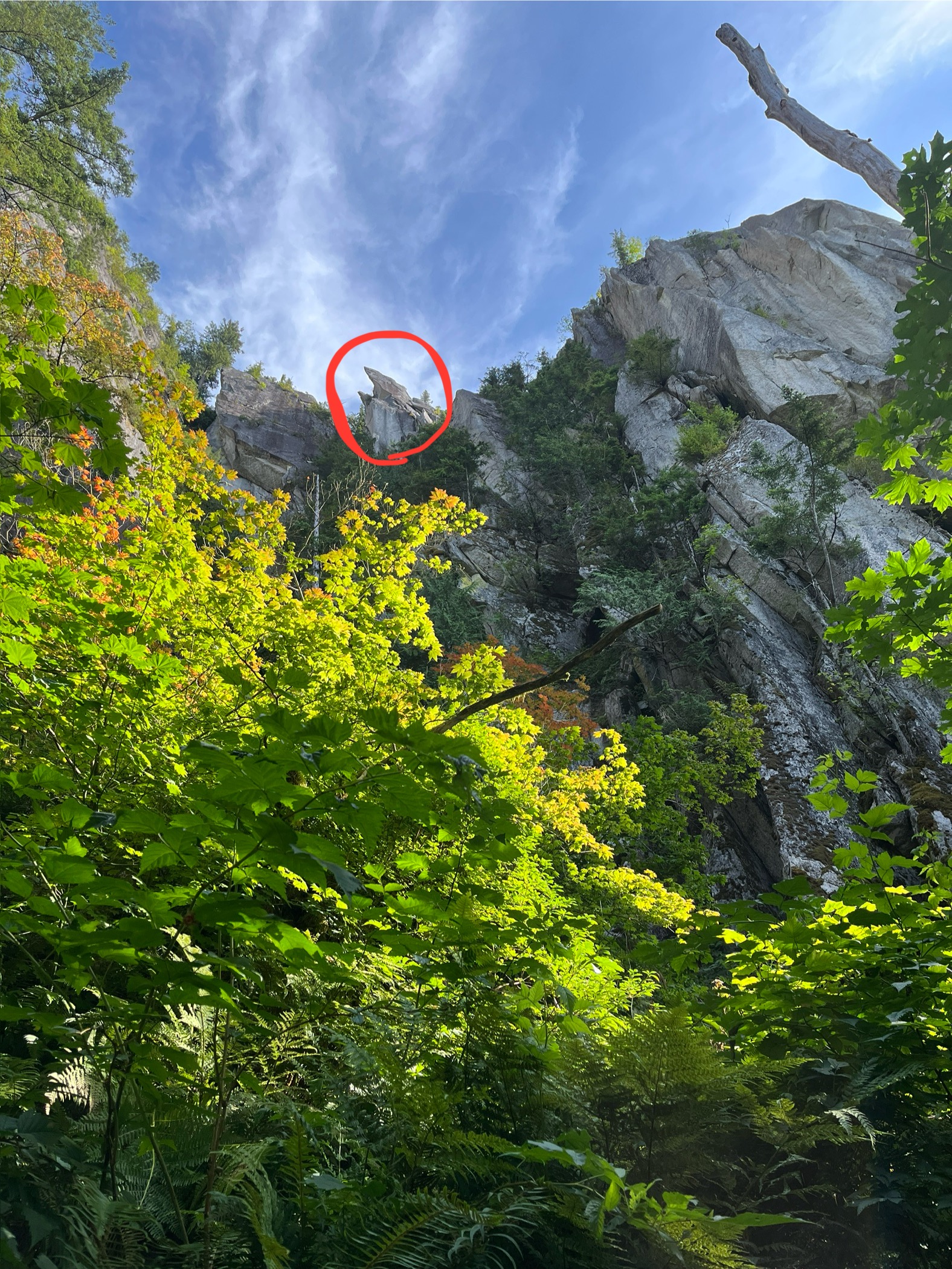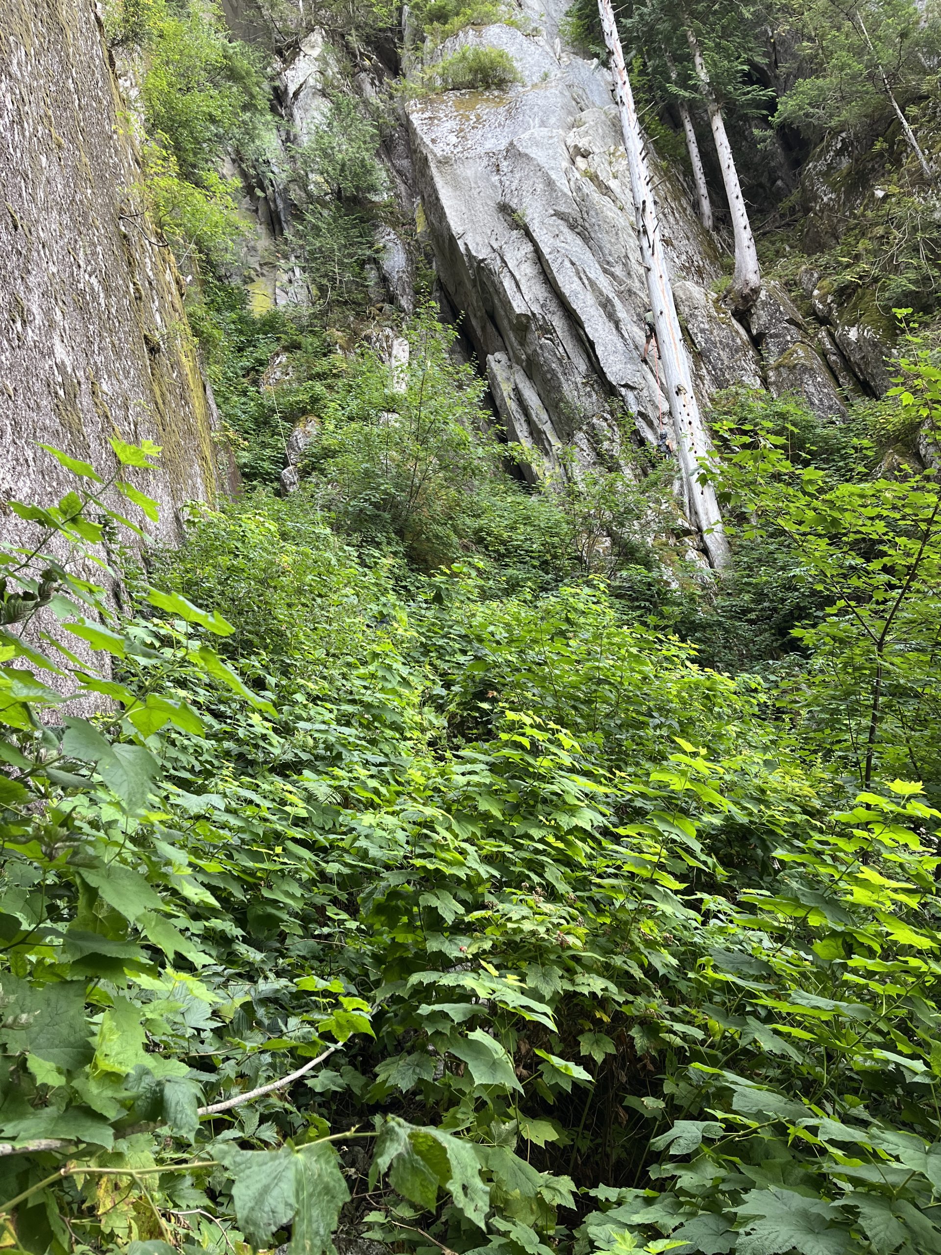 アプローチは最初はスラハニーのトレイルを辿り、壁の手前で左へとトラバースしていき、さらに奥を目指します。草をかき分けながら進む、ちょっと険しいアプローチでした。
