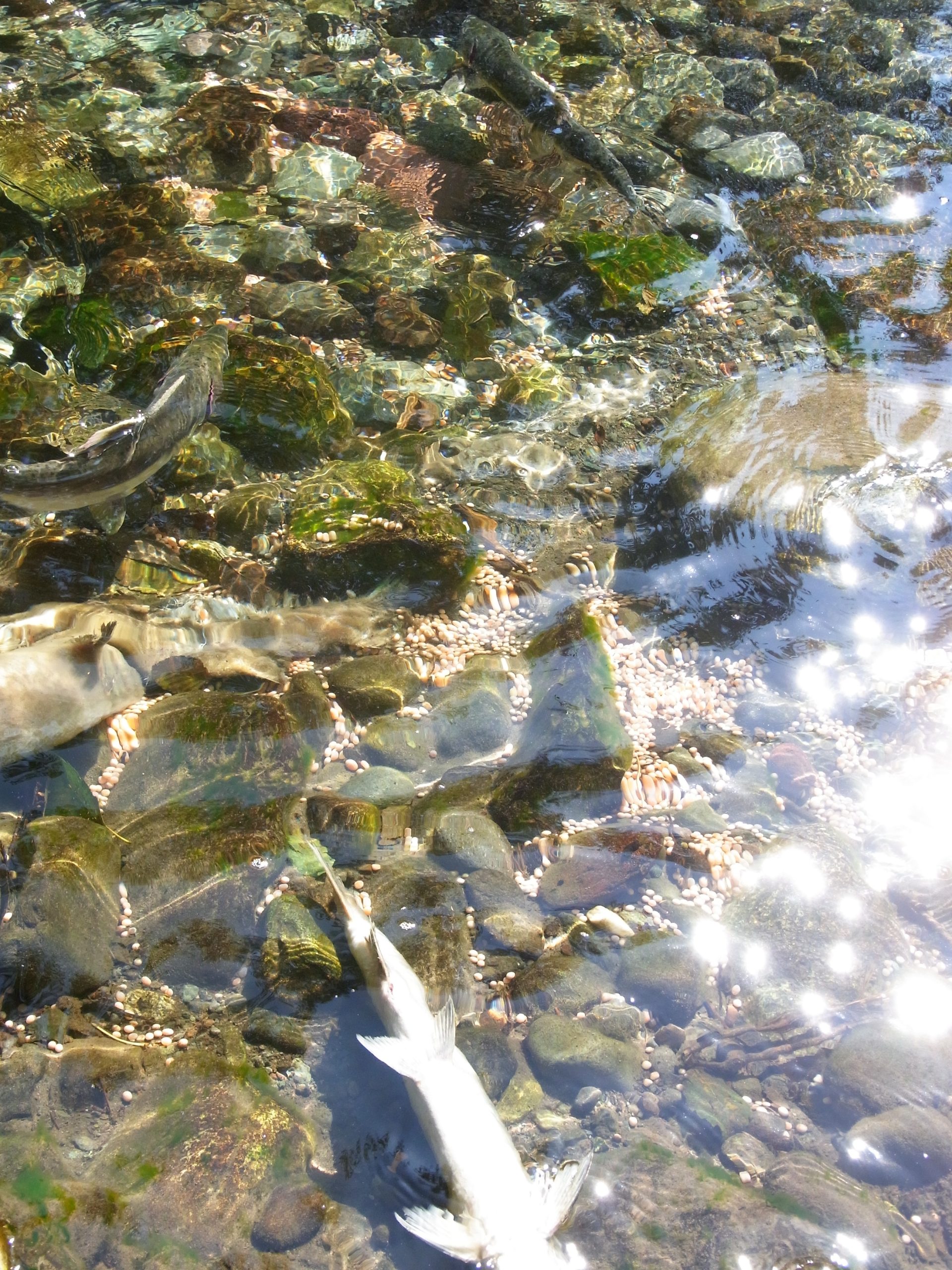 ひたすら上流へと流れに逆らって向かう姿。鮭生最後の最大目標のために雄を、雌を、取り合う姿。産卵を終え、絶えゆく姿。絶えた肉体が腐敗していく姿。全て見ることができます。死んだサーモンがたくさんいるのでニオイもそれなりに臭いです。見た目もかなり生々しいです。そんな、自然を真っ向から感じることのできるサーモン観察。秋に来た際にはぜひ行ってみてください。