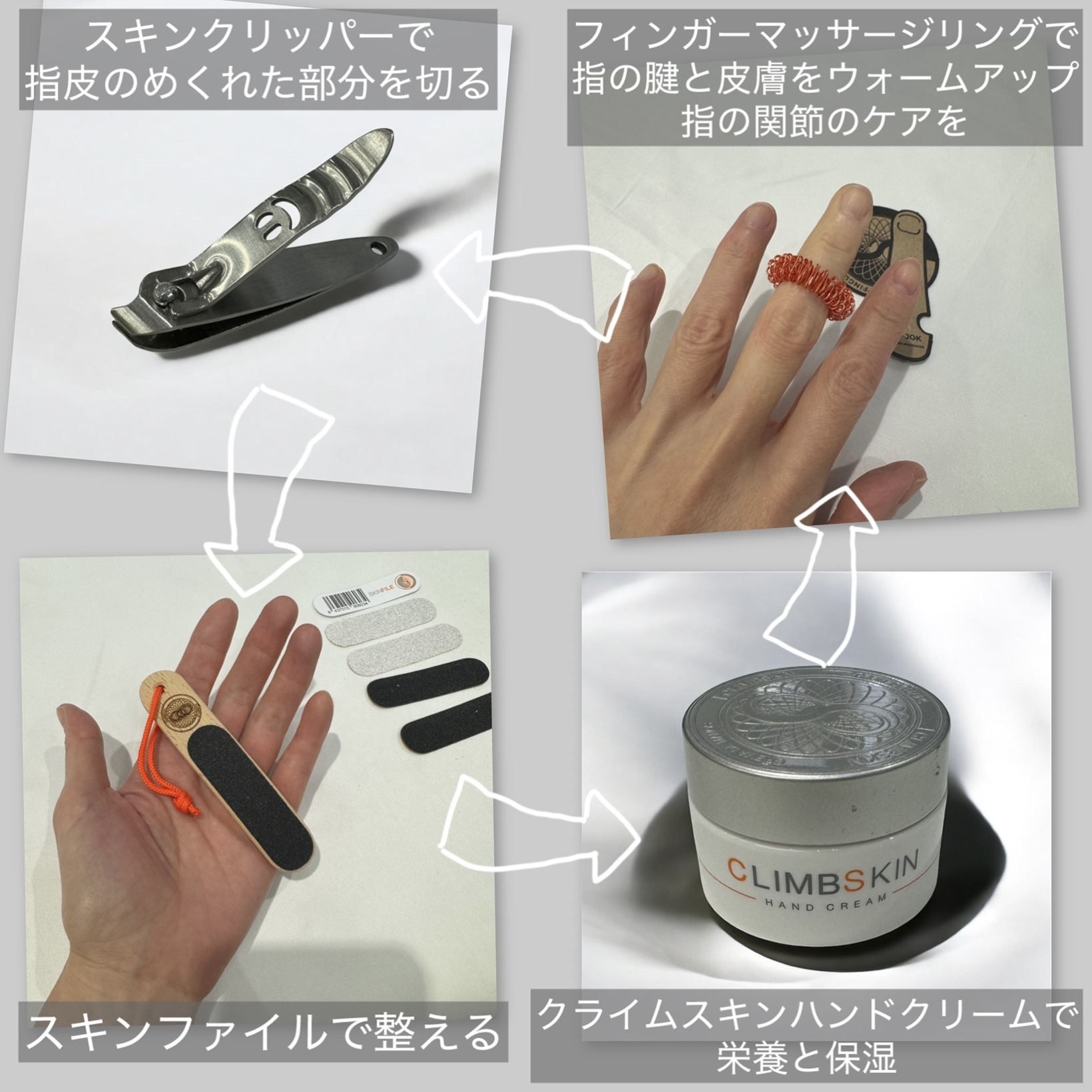 クライマーの指皮を最高の状態に保つためのハンドクリームや爪切りなどを提供。
