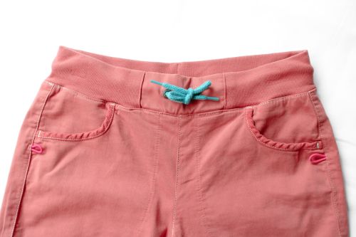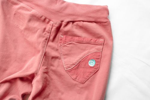背面のポケットにはベルベットのアクセントがあしらわれており、ウエストはゴム仕様で調節可能。