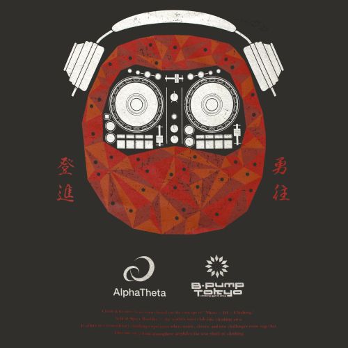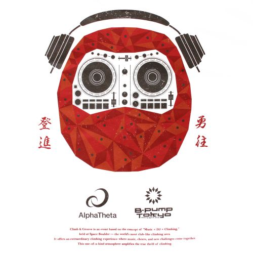 バックには AlphaThetaとB-PUMP TOKYO のロゴとともに、すべてのクライマーへのメッセージとして「勇往登進」の言葉をデザインに落とし込んでいます。