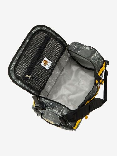 機能:背負うことのできるショルダーハーネス/D字型で大きく開くファスナーオープニング/強度の強いバータックとステッチ/両サイドに荷揚げ用ハンドル/4本のコンプレッションストラップ/サイドデイジーチェーン/フラップ裏にメッシュポケット/IDウィンドウ/収納用メッシュバッグ付属/ファスナーつきのサイドポケット/サイドにキャリー用のグラブハンドル/USA企画