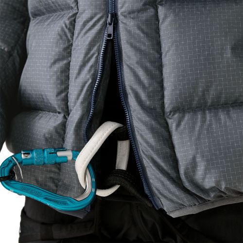 2つの大型ジッパー式ハンドウォーマーポケットはハンギングビレイでもアクセスしやすく、左側のポケットにパーカ本体を収納可能。内側の2つのドロップイン型メッシュポケットは手袋やクライミングシューズを温めておくのに便利