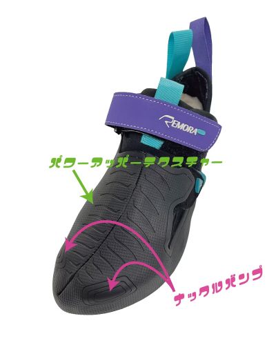 一般的なソフトシューズはその柔軟性によりフィッティングに優れ、スメアリング性能やサーフェスの応答性は高いものの、フック系のアクションではパワーアシストが薄く、どうしても物足りない印象をお持ちではないでしょうか。レモラプロではフック系テクニックに着目し、革新的技術でそれらを強化する事に成功しました。トゥーフックによるカウンターアクションをアシストする「アッパーの素材とデザイン」を、そして確実で多彩なヒールフックを実現する唯一無二の「3Dフッキングリム」を携えたヒールカップは、ヒールアクションをサポートするギミックが導入されています。