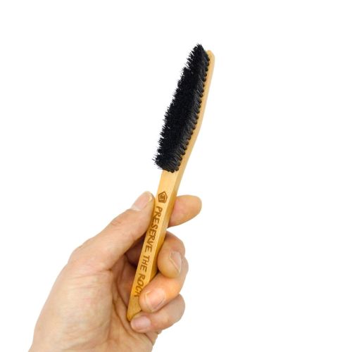 ブラシ部分には天然毛を採用。チョークや汚れをしっかり落としながらも、ホールドを傷めにくく、ジム・外岩のどちらでも安心して使用できます。