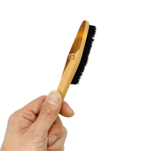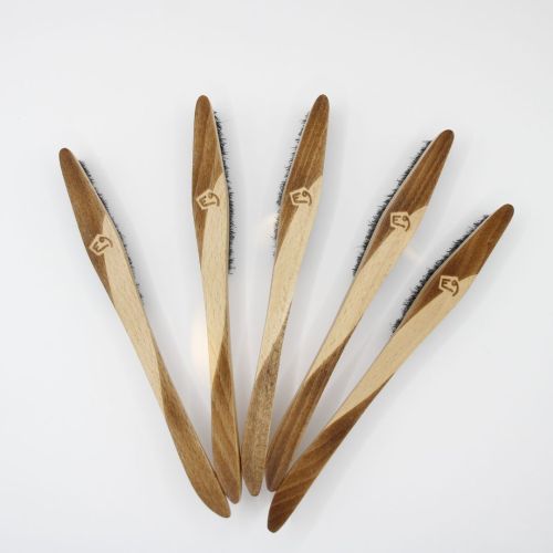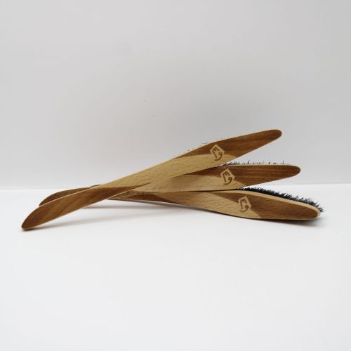 人間工学に基づいて設計された木製ハンドルは、手にしっくりと馴染み、長時間のブラッシングでも疲れにくい設計。無駄のないフォルムが、細かいホールドや奥まった部分にも的確にアプローチします。